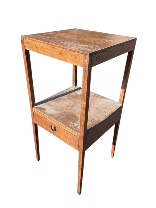 A Georgian mahogany bedside table with square top above an undershelf with brass ring handled drawer, raised on square legs. (15in x 15in x 32in)