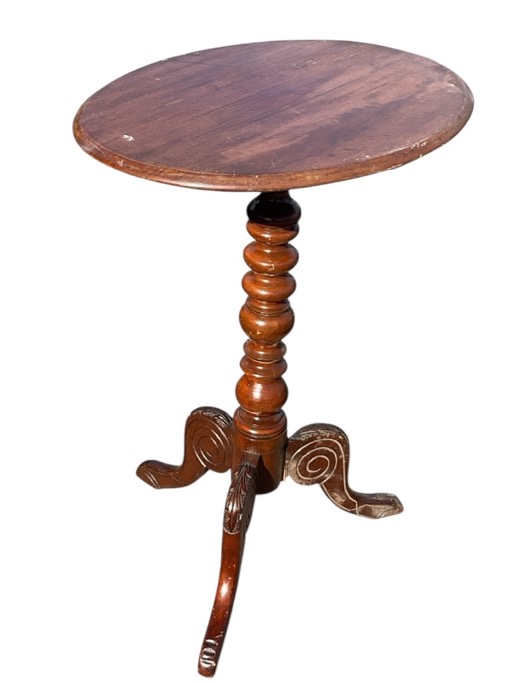 A Victorian mahogany wine table with oval top on a bobbin turned column, raised on a tripod base with scroll and leaf carved legs. (21in x 17in x 29in)
