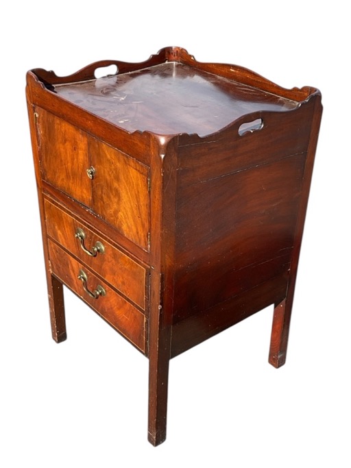 A Georgian mahogany bedside cabinet, the rectangular wavy edge tray top with pierced handles above a pair of doors and a brass handled deep double drawer, raised on square legs. (20in x 17in x 31in)