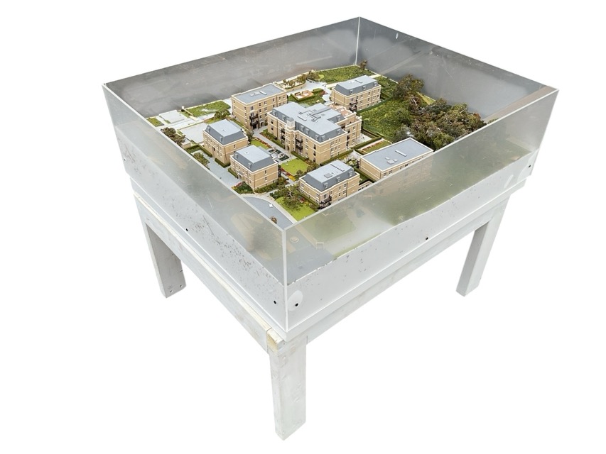 An architectural model of Atkinson Close, London, with named apartment blocks and electric lights, in a detailed complex of paths & gardens, raised on painted wood stand - working. (41in x 33.5in x 32in)