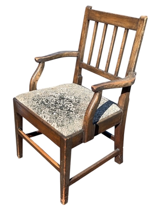 A Georgian country elm armchair with rectangular slatted back and drop-in upholstered seat flanked by serpentine shaped arms, raised on square tapering legs joined by stretchers.