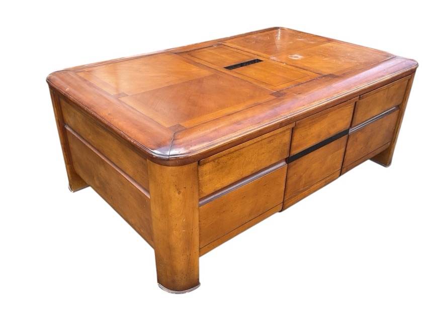 A contemporary walnut deco style coffee and games table, with reversible parquetry chessboard panels flanking a central tray, above drawers raised on rounded rectangular feet. (41in x 18in x 13.5in)