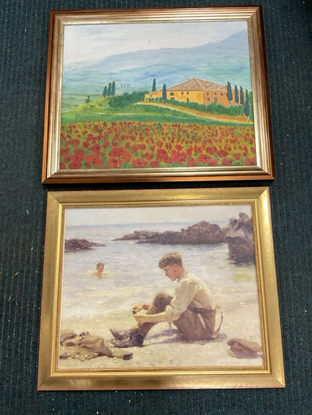 Judy Kyle, oil on canvas, Italian landscape with villa, titled Tuscan Retreat to verso, signed and gilt framed; and Henry Scott Tuke, coloured print, TE Lawrence as a cadet on Newporth Beach, signed in the print, and gilt framed. (2)