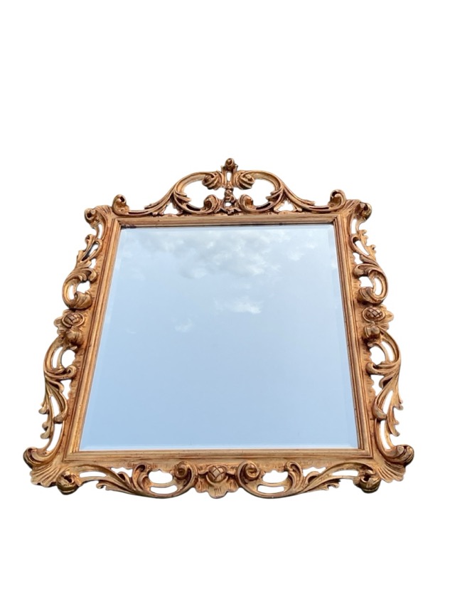 A Georgian style carved giltwood mirror with pierced acanthus scrolled mounts to moulded rectangular frame, with confirming scrolled Chippendale style crest - the plate bevelled. (31in x 44in ext)