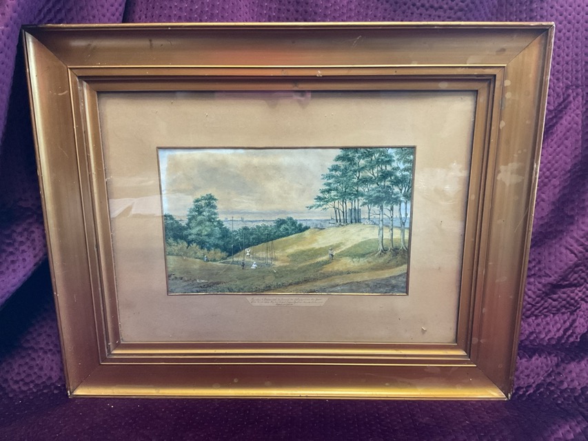 James Johnson, watercolour, extensive landscape - possibly London with children playing on hilly foreground, labelled “Painted & Presented… 1909…by… aged 83 years”, mounted & gilt framed. (14.5in x 9in)