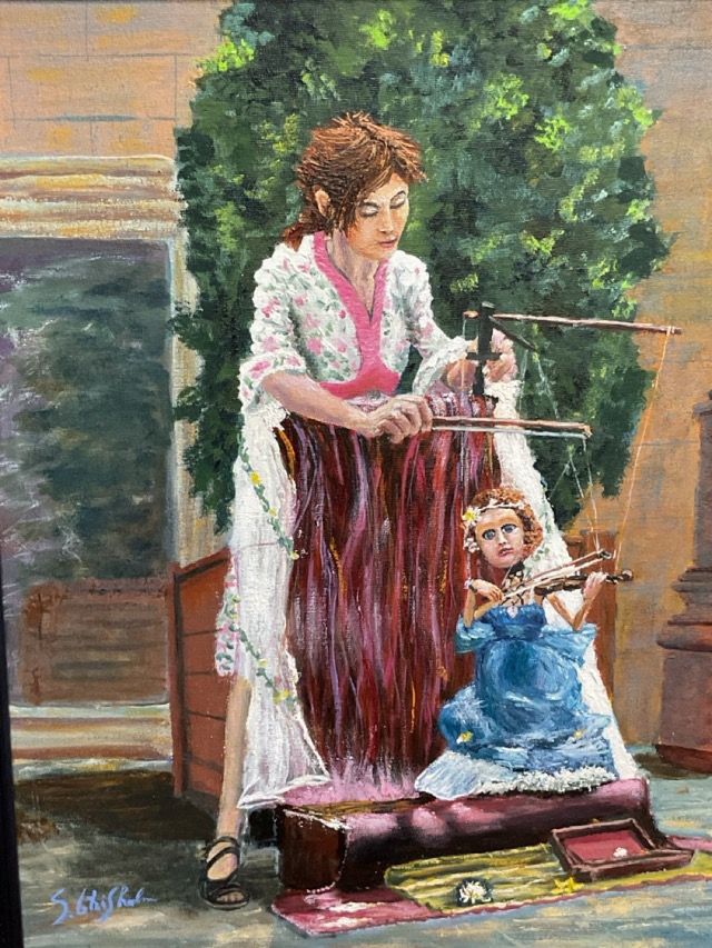 Steve Chisolm, oil on board, lady puppetier with marrionette, signed, labelled to verso Puppet Maestro of Cartagena, framed. (15.5in x 19.5in)