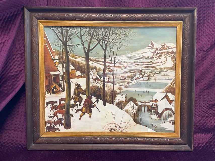 Manuella Norris, watercolour, winter landscape scene after Pieter Bruegel the Elder, signed, in carved frame with gilt slip. (20.75in x 16.75in)