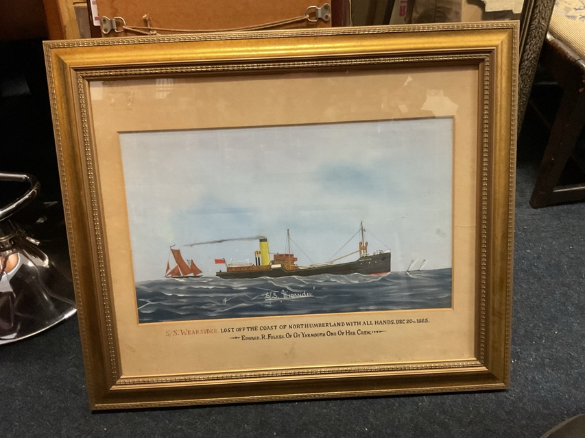 A 1925 watercolour, study of the steamship SS Wearsider with sailboats in background, in remembrance to crew members lost off Northumberland coast with all hands, mounted & gilt framed. (18.75in x 11.25in)