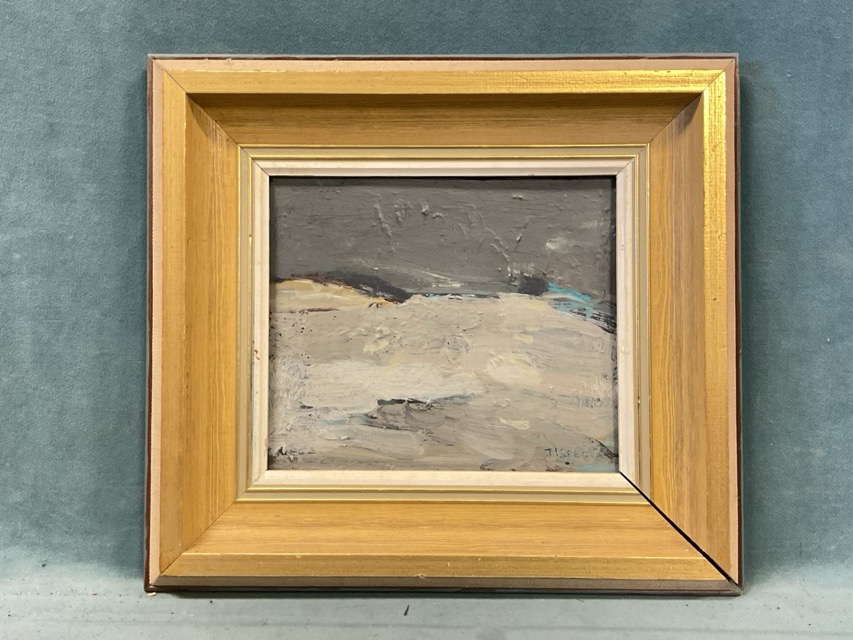 Jane Soeder, oil on board, abstract landscape, titled to label verso Winter near Melrose, signed & framed. (7.25in x 6.25in)