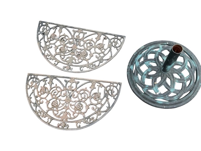 A pair of cast iron D-shaped entranceway panels with pierced foliate scrolled decoration; and a iron sunshade stand with pierced interwoven circular base. (3)
