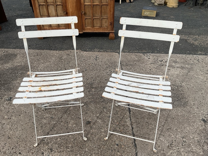 A pair of painted folding metal garden chairs with slatted backs & seats on rectangular folding framed supports with pad feet. (2)