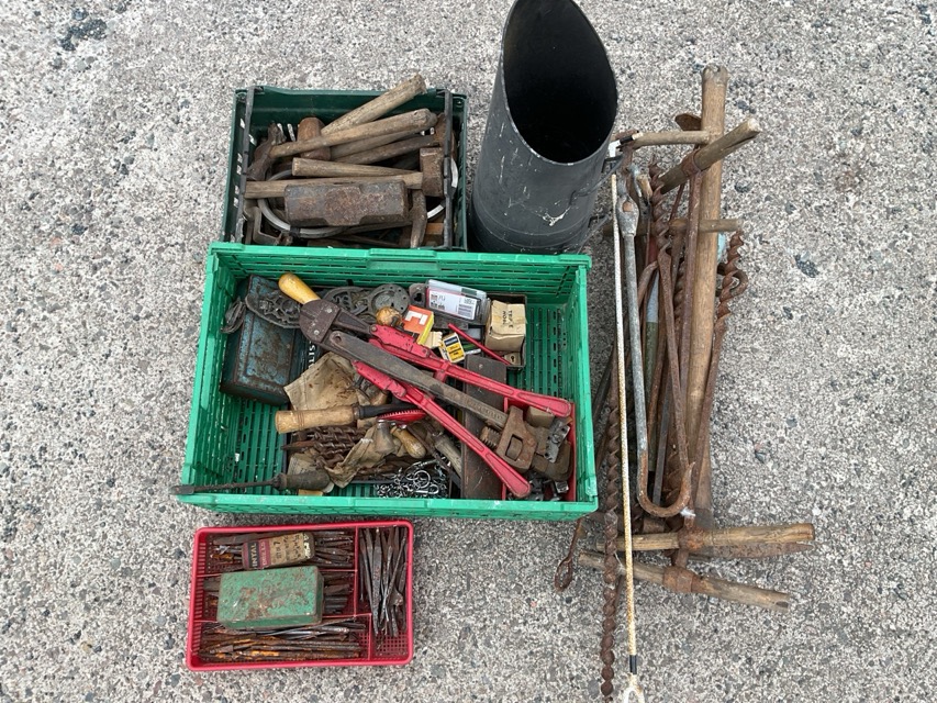 Miscellaneous tools - hammers, augers, a pick, a coal scuttle, bolt cutters, files, horse brasses, chains, drills, a lump hammer, materials, etc. (A lot)
