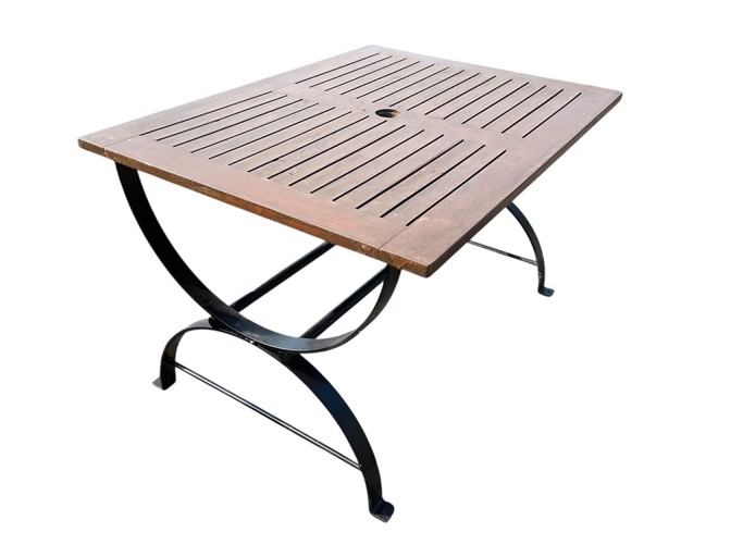 A rectangular garden table with slatted teak top on arched frame joined by twin tubular stretchers, the top pierced for sunshade. (47.25in x 35.5in x 29in)
