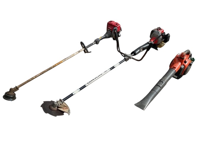 A Lawn Flite P8550 petrol powered brush cutter with metal blade; a Honda petrol strimmer with cord cutter; and a Husqvarna X-Series 125BV petrol leaf blower. (3)