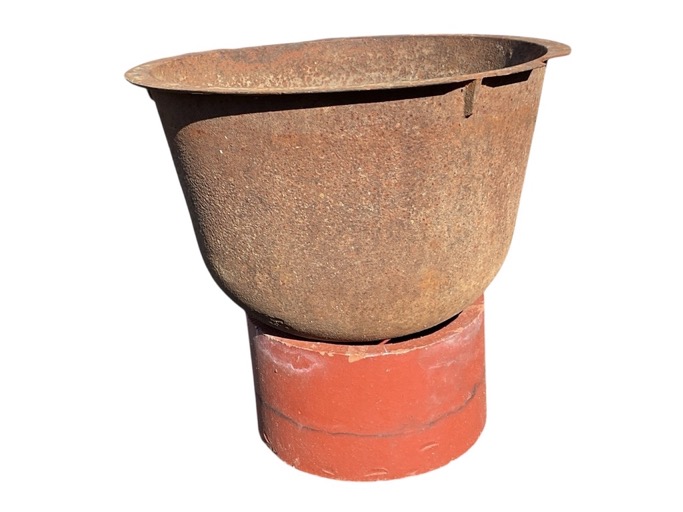 A cast iron urn or boiling/cooking pot with flat rim, supported on an associated terracotta pipe stand. (17.5in x 15.75in) (A/F)