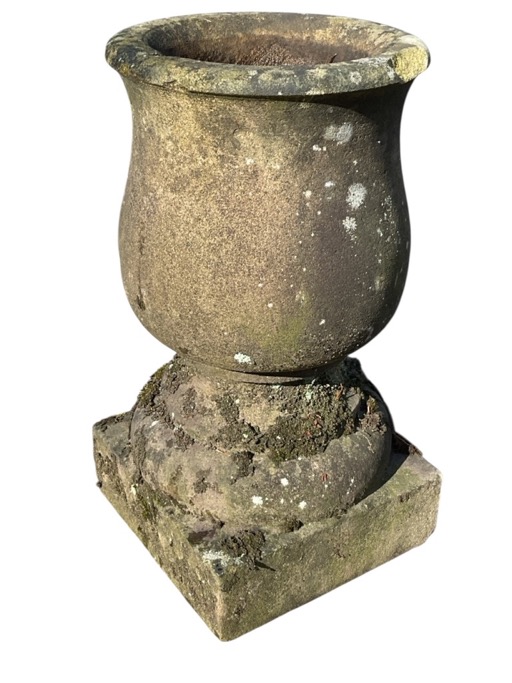 A C19th sandstone garden urn, the tall bulbous vessel on circular base above square plinth. (16.75in)