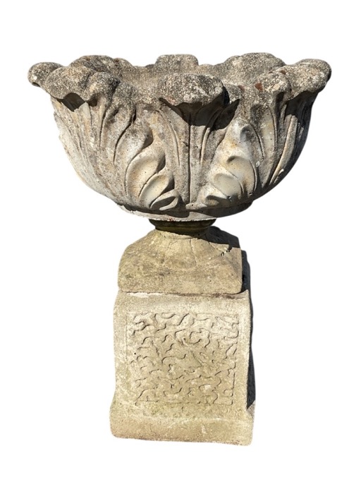 A composition stone garden urn on an associated stand, the leaf cast vessel on fluted socle with square plinth, the square column support with seaweed type moulded panels. (25.5in)