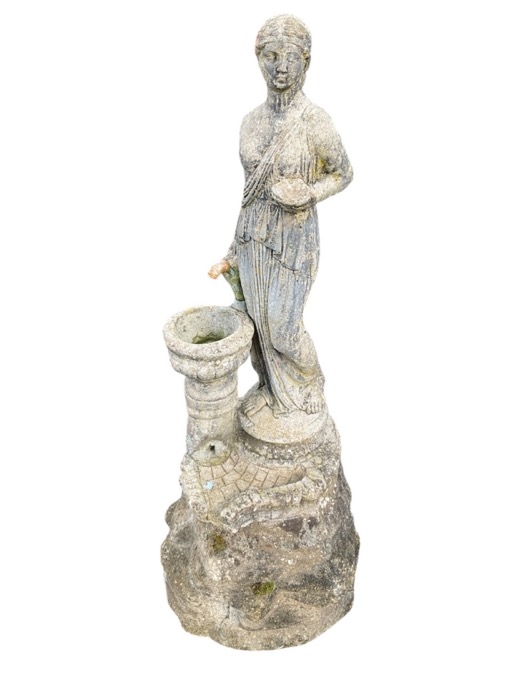 A composition stone garden sculpture with classical draped lady beside an urn above a pool, mounted on an associate rocky cast support- piped for water. (41.75in)