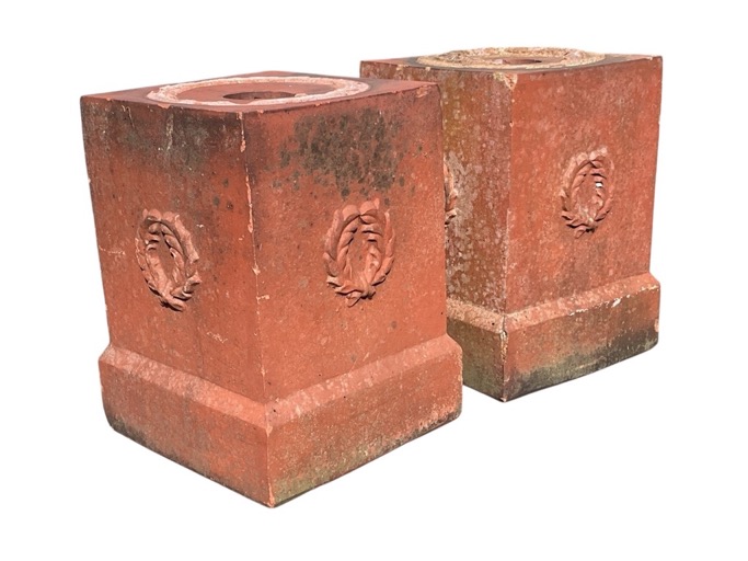 A pair of Victorian terracotta garden urn stands cast with wreaths to side panels, supported on chamfered plinths. (14in x 14in x 18in) (2)