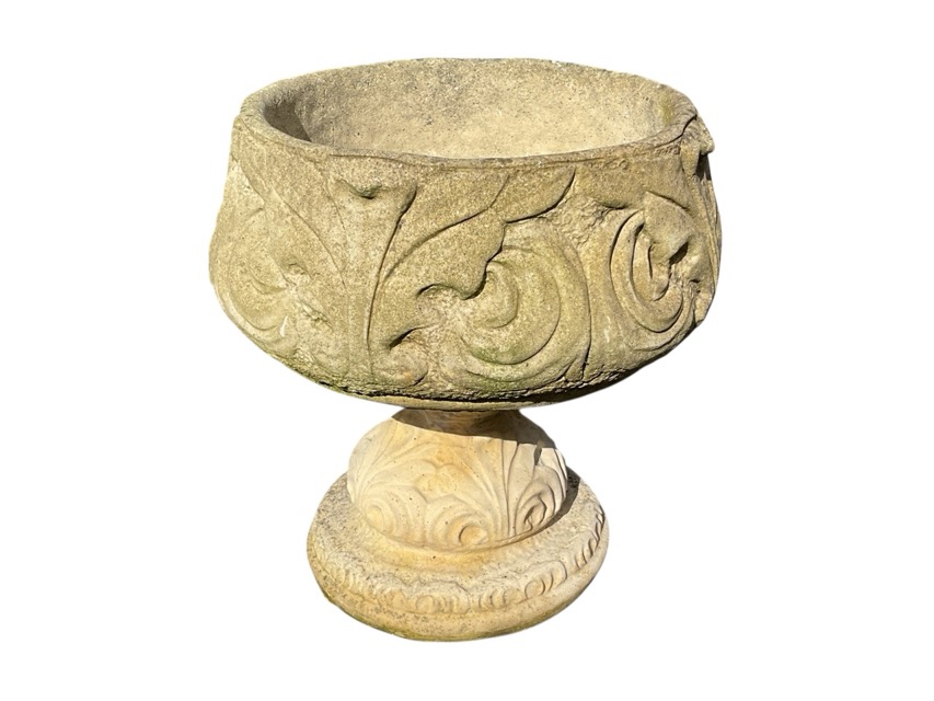 A composition stone garden urn of tulip shape cast with leaf scrolling to vessel, raised on conforming socle with circular plinth. (17in x 18in)