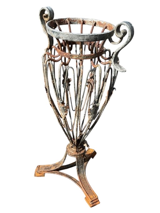 A wrought iron garden urn of trophy form having scrolled handles to wirework body with leaf mounts, supported on triangular base with block feet. (23.25in)