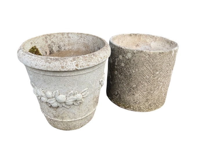 A painted composition garden pot of tapering bucket shape, embossed with fruit & leaves; and a plain tubular garden tub. (14in & 12.5in) (2)