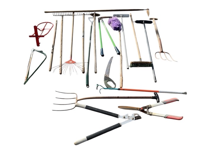 Miscellaneous garden tools - rakes, hoes, saws, brushes, shears, a saddle rack, etc. (20)