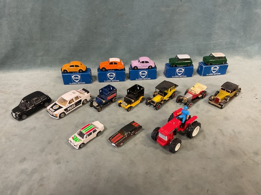 Fifteen diecast model cars - boxed Corgi Fina Classic Motors - VW Beetle, Citroën 2CV, Morris Minor, and Minis, Matchbox Models of Yesteryear, Lledo vintage delivery vans, a black cab, a tractor, a Mercedes police car, etc. (15)