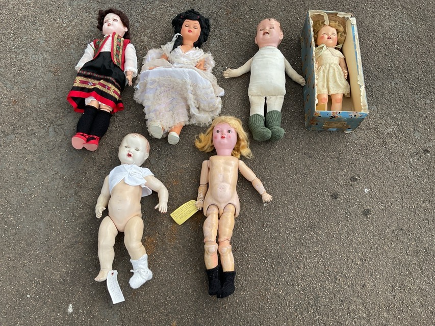 A 20s Belgian composition doll with mohair plaits; a 50s Italian celluloid bride doll by Athena; a 20s boy cloth doll with composition head; a 50s boxed Pedigree Delite doll with original costume; a 40s English plastic baby doll; and an Edwardian composition body with replacement 50s composition head. (6)