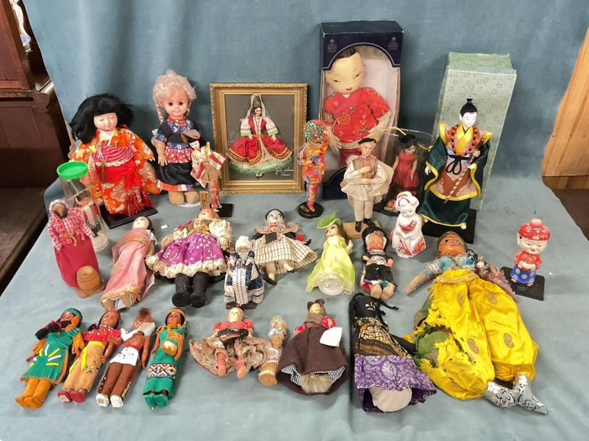 A collection of dolls in traditional and national costumes -Japanese, Chinese, Singaporean, Dutch, Spanish, African, Welsh, Indian, Shetland, Native American, etc. (28)