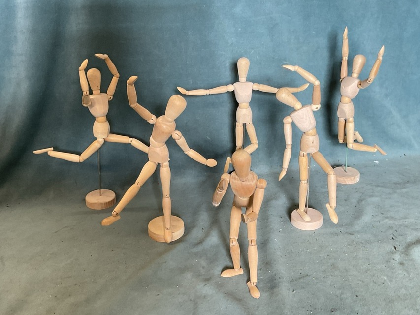 Six hardwood 12in lay figures, five with circular stands, with poseable limbs and articulated bodies. (6)