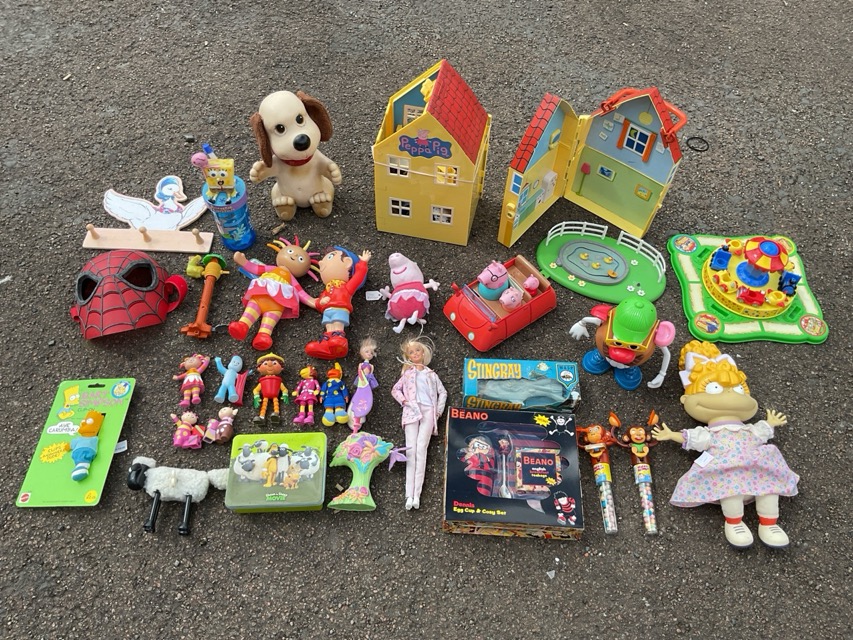 Miscellaneous childrens memorabilia - Pepper Pig doll houses, figurines, playsets, In the Night garden, The Simpsons, Shaun the sheep, Rugrats, Barbie, a Dennis the Menace egg cup & cosy, a Mr potato head, a Spongebob cup, a Spiderman mask, a Beatrix Potter coat rack, etc. (A lot)