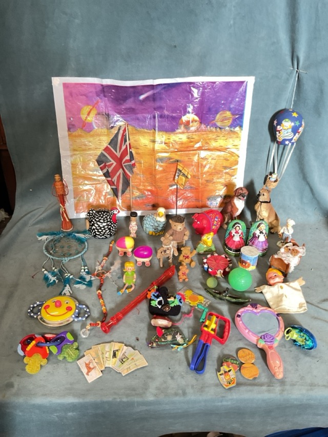 Miscellaneous toys - money boxes, dream catchers, bookends, a clown balloon pendant, babys teethers, a talking hand mirror, a recorder, teddy bear and dog figures, cigarette cards, a cat miaow box, figures, a Disney pillbug, badges, a 3D space print, etc. (A lot)