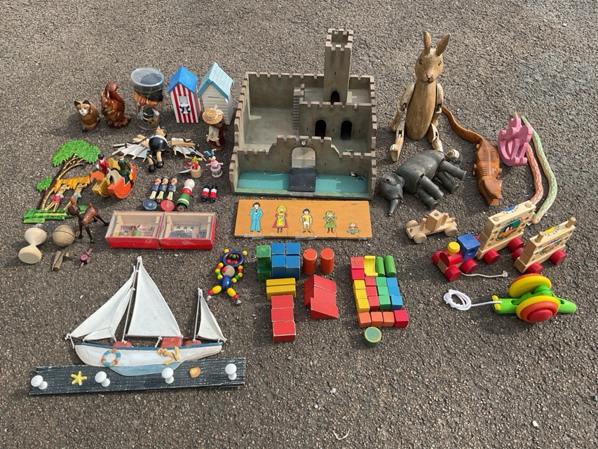 A collection of wood toys - a castle with bridge, a rabbit & elephant, building blocks, handmade articulated crocodile and snakes, soldiers, pull toys, money boxes, dioramas, a figure with wings and hanging wire, etc. (a lot)