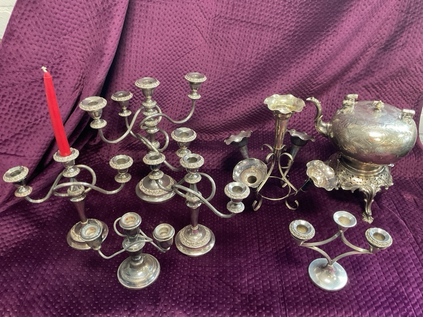 A set of three silver plated candelabra with reeded scrolled branches; a silver plated eperne with five trumpet shaped vases on scrolled stand; a large Victorian eastern engraved tea kettle on stand; and two other three branch candelabra. (7)
