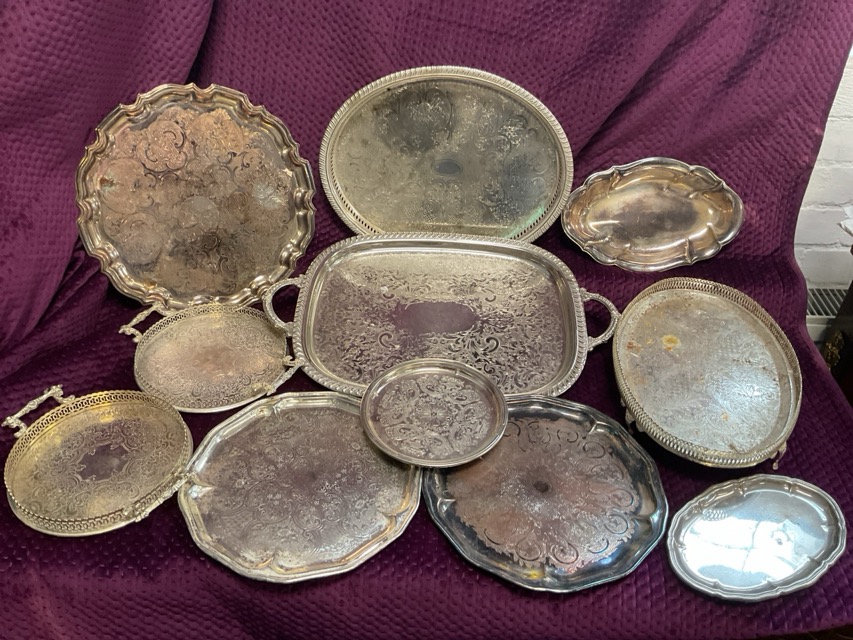 Ten silver plated trays & salvers - circular, gadroon rim moulded, gallery type, oval, engraved on feet, scalloped, etc. (10)
