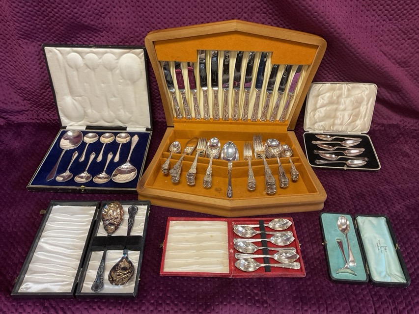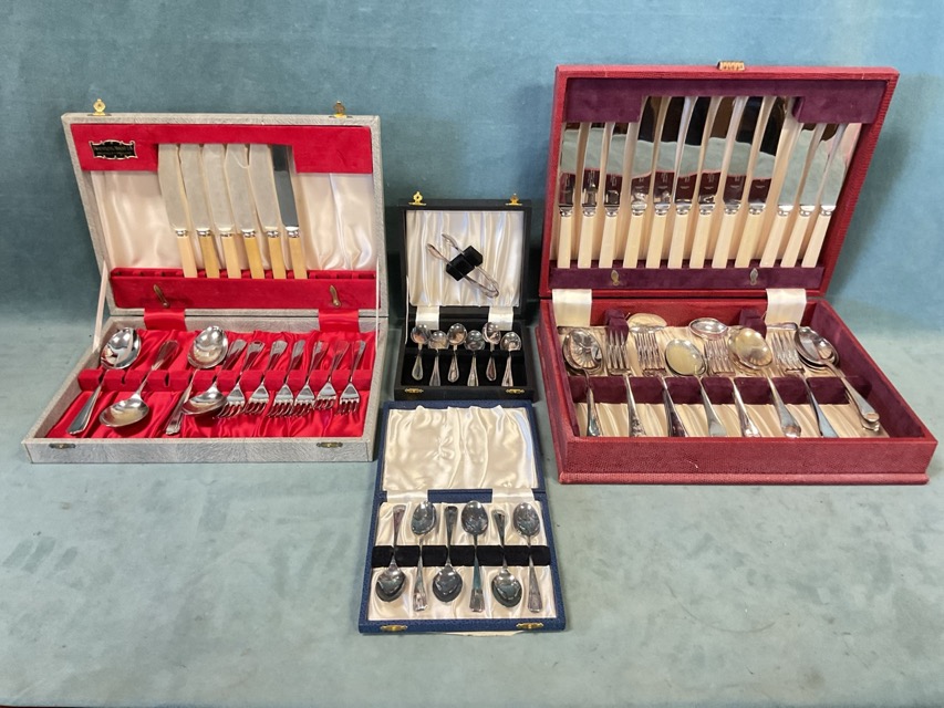 A canteen of deco chromed cutlery; another containing Old English pattern silver plated cutlery; set of silver plated teaspoons; and another of bead pattern teaspoons and sugar tongs. (4)