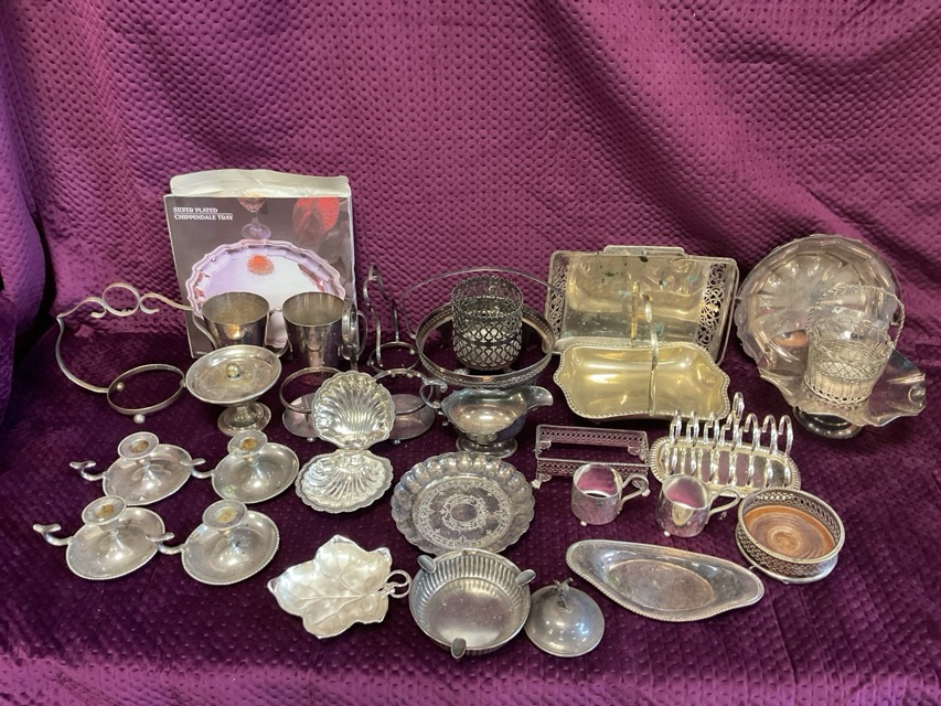 A quantity of silver plate - stands, a set of four candlesticks with beaded rims, ashtray, cake baskets, tankards, a toast rack, a gravy boat, butter dishes, salvers, coaster, etc. (A lot)