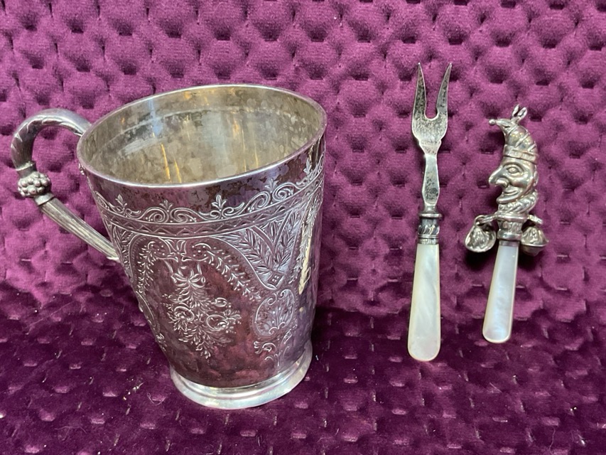A Victorian hallmarked silver christening mug, with engraved swag decoration, inscribed Dulcie - London, 1883; a silver babys rattle in the form of Mr Punch, with mother of pearl handle - Birmingham, 1956; and a hallmarked silver pickle fork - Sheffield, 1907. (3)