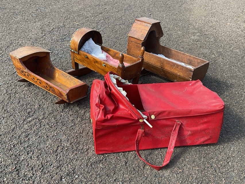 Three scratch built dolls cradles, raised on shaped rockers - old & painted, brass studded and chamfered; and a faux leather Luxiproduct crib with carriage handles. (4)