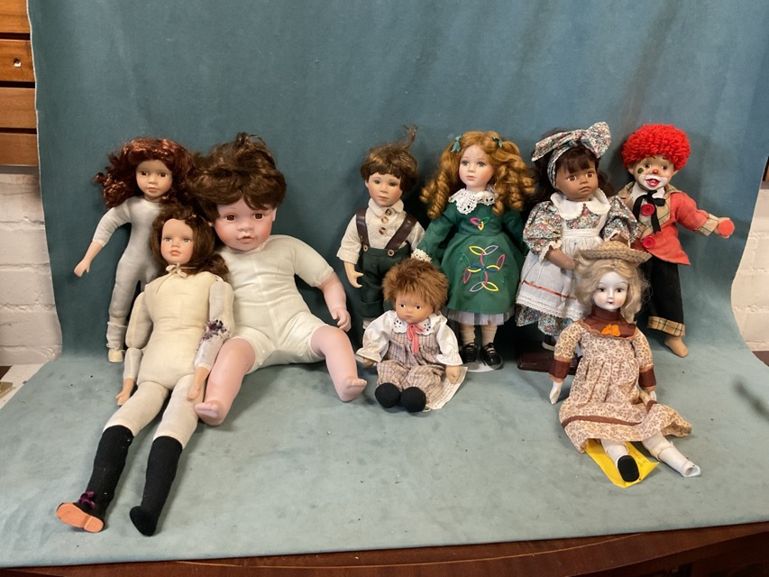 A collection of modern porcelain headed dolls with cloth bodies and ceramic forelimbs, including an Alberon Irish dancer, James by Leonardo, a clown, a girl in a pinafore, a Victorian style girl, three unclothed dolls and a small boy. (9)