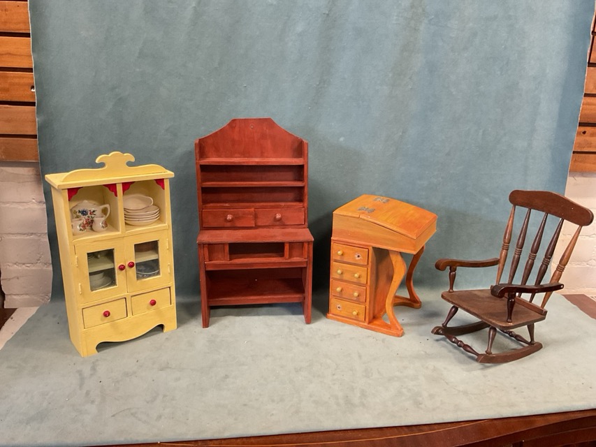 Four items of dolls furniture - a painted wood cupboard containing miscellaneous dolls ceramics, a varnished wood dresser, a grained pine davenport desk with drawers, and a windsor style spindle back rocking chair. (4)