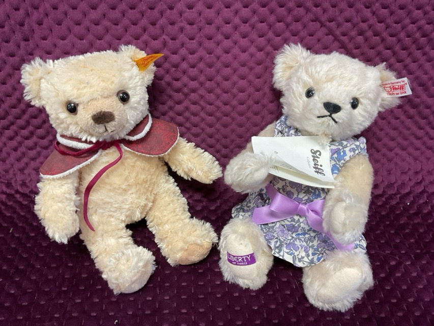 A Steiff Liberty bear with hard mohair body and articulated limbs, wearing a violet floral dress - 10in; and a soft Steiff Clara bear with red cape - 9.25in. (2)