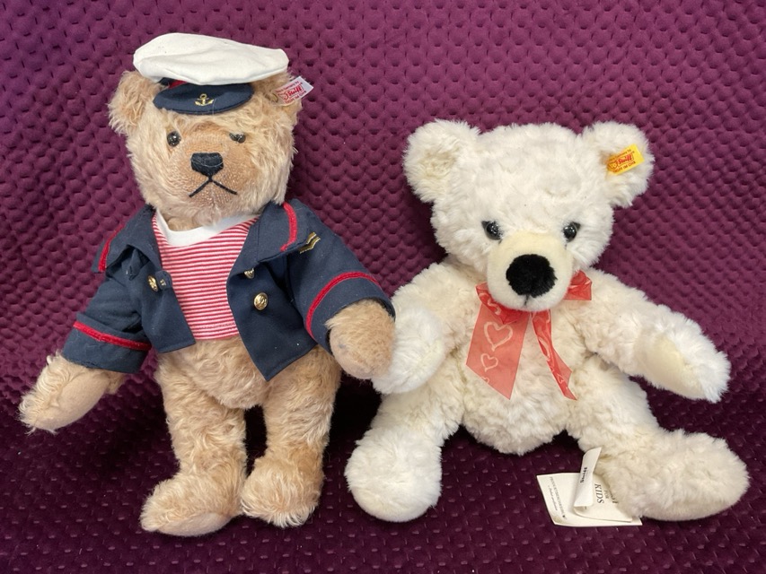 A Steiff mohair limited edition Jack bear in sailors outfit, having jointed arms & legs with felt pads - 13.75in; and a white Steiff soft Bernie bear - 13.5in. (2)