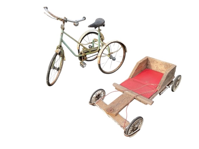 A 50s childs Lonerider tricycle with sprung seat, spoked wheels, bell to handlebars, chainguard, etc; and four-wheel go-cart with wood frame and steering front axel. (2)