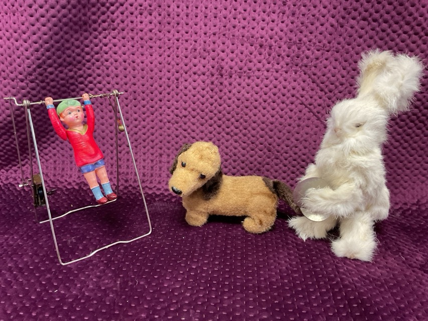 A clockwork toy rabbit with clapping cymbal mechanism, having glass eyes and fur body; a mohair clockwork dachshund; and a 60s mechanical swinging boy on wire frame. (3)