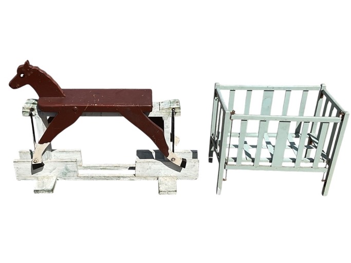 A 40s painted rocking horse with plank seat and cutout head swinging on a trestle base - 36in x 13in x 24in; and a 50s painted dolls cot with slatted sides and base, raised on square legs - 21.5in x 11.5in x 18.25in. (2)