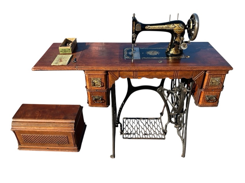 A mahogany cased Singer sewing machine - model 12909987- with cast iron treddle support and four small drawers, complete with instructions, attachments, key, etc. (44in x 42in x 40.75in)