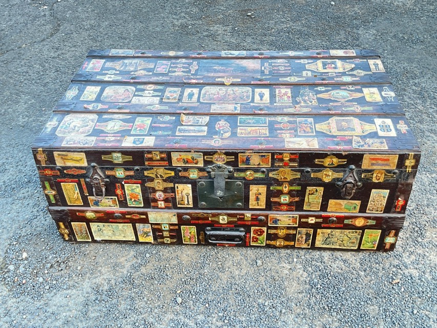 A late Victorian trunk with lined interior having studded battens and iron mounts, pasted with miscellaneous scraps including cigar papers, cigarette cards, colonial cut-outs, etc. (32in x 18.5in x 12in)