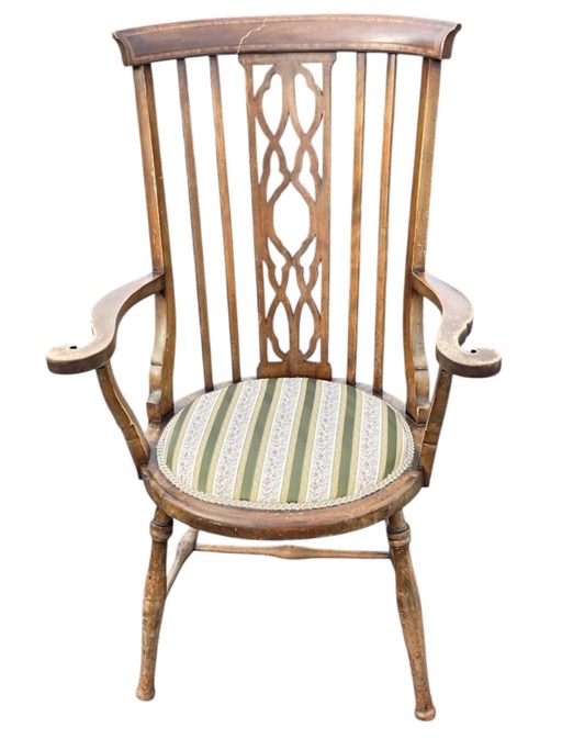 An Edwardian mahogany armchair, the back rail with satinwood banding above a pierced splat framed by slats, the arms with scrolled terminals, the circular seat on angled turned legs.